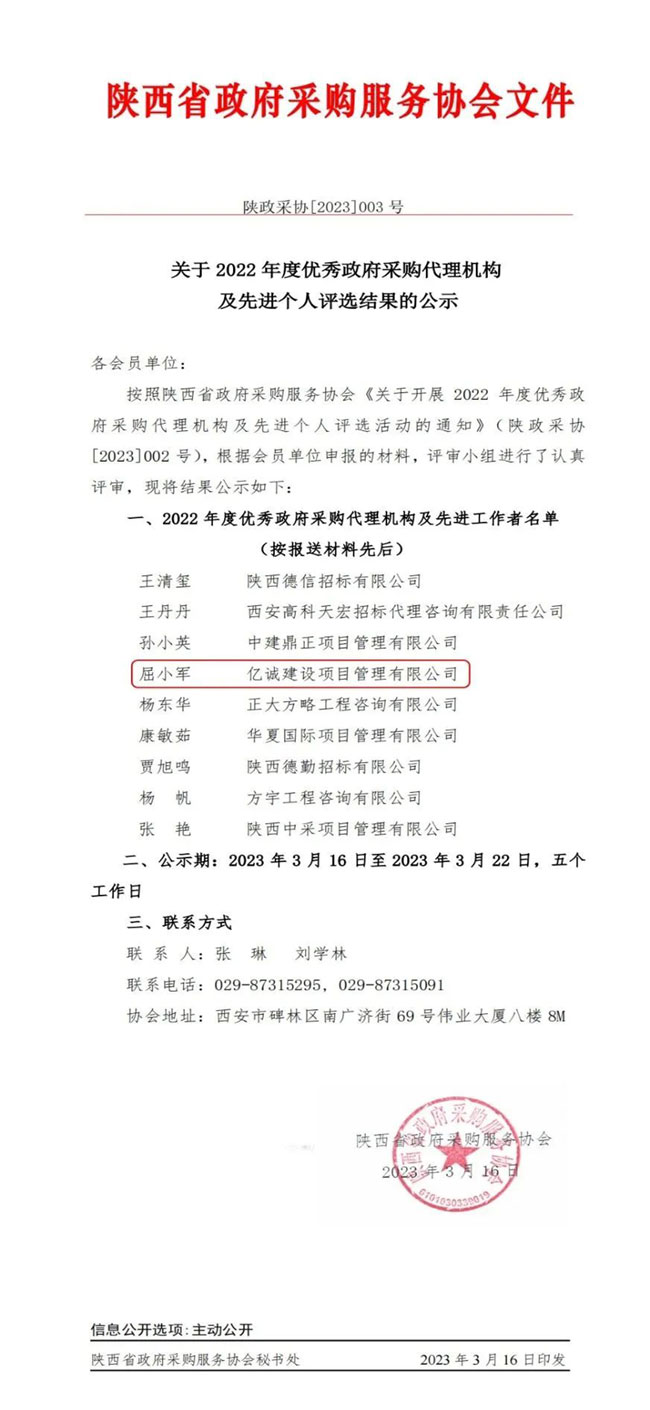 億誠管理屈小軍總工獲評“2022年度陜西省政府采購代理機構先進工作者”榮譽稱號!
