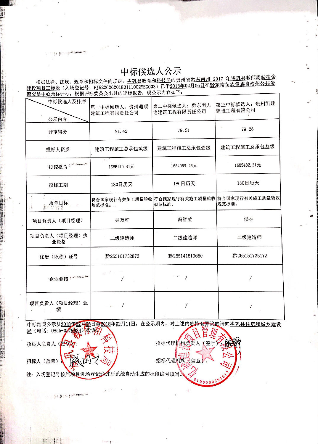 根據法律、法規、規章和招標文件的規定,岑鞏縣教育和科技局的貴州省黔東南州2017年岑鞏縣教師周轉宿舍建設項目三標段(入場登記號:FJ52262620180111002YSG003)已于2018年02月06日在黔東南苗族侗族自治州公共資源交易中心開標評標,根據評標委員會出具的評標報告,現公示內容如下:
